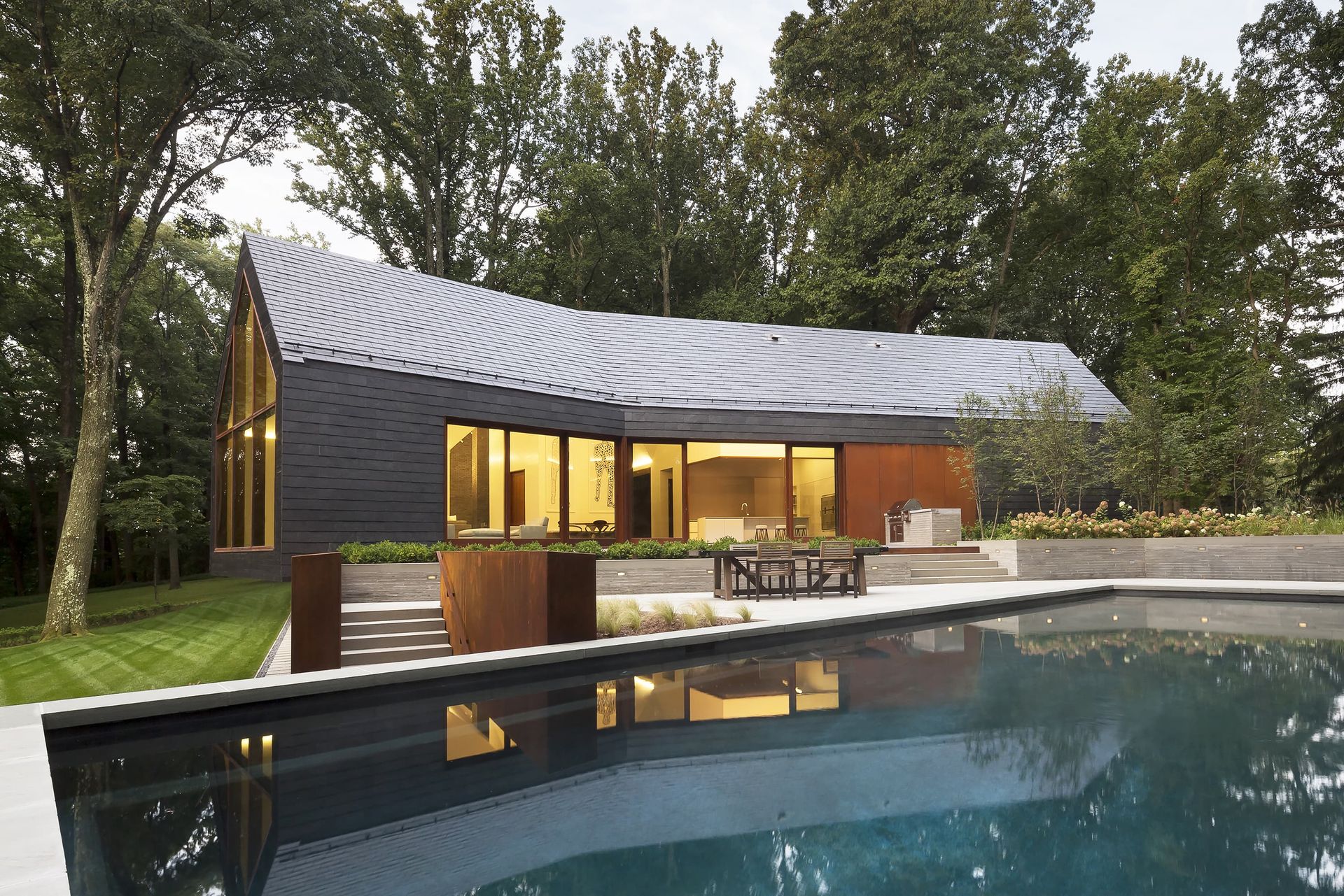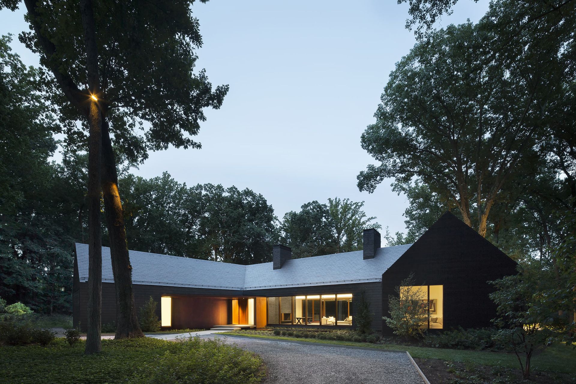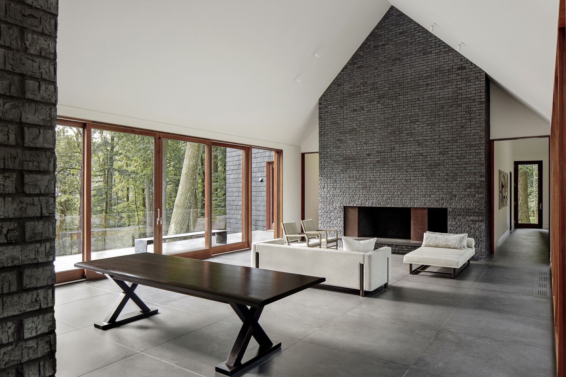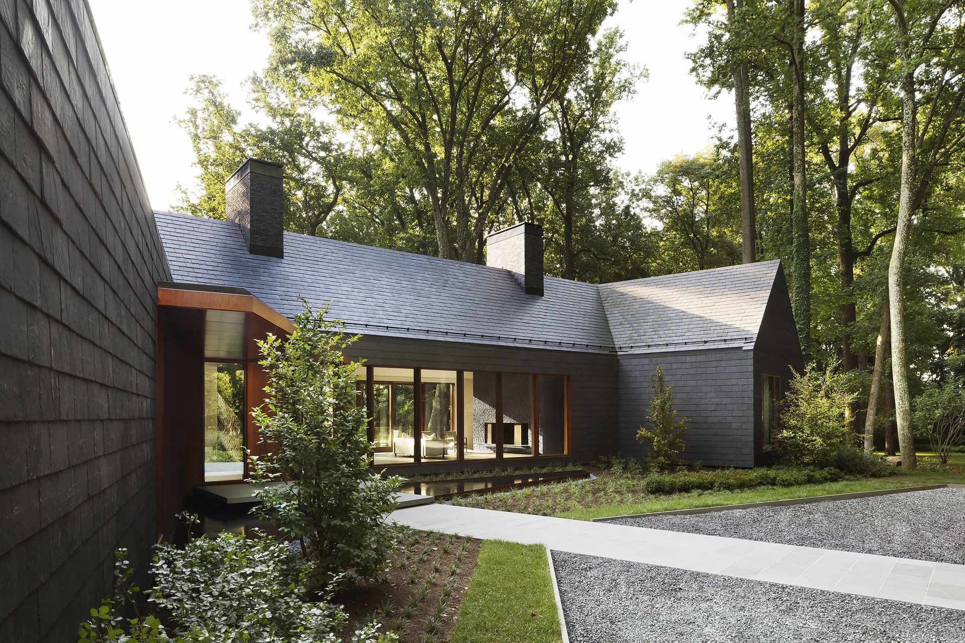 Architecture firm Ziger|Snead and interior designer Jay Jenkins led that vision, shaping the soul of the home around memory and renewal, protection and transparency. The 7,000-square-foot residence embraces an archetypal gable form, deliberate in its simplicity. Cathedral ceilings draw the eye toward the surrounding forest canopy. Dark slate and charred wood protect the façade while referencing the former home. Mahogany-framed window walls dissolve the boundary between interior and landscape. Landscape design by Campion/Hruby reinforces the material discipline, grounding the home in stone, steel, wood, and water.