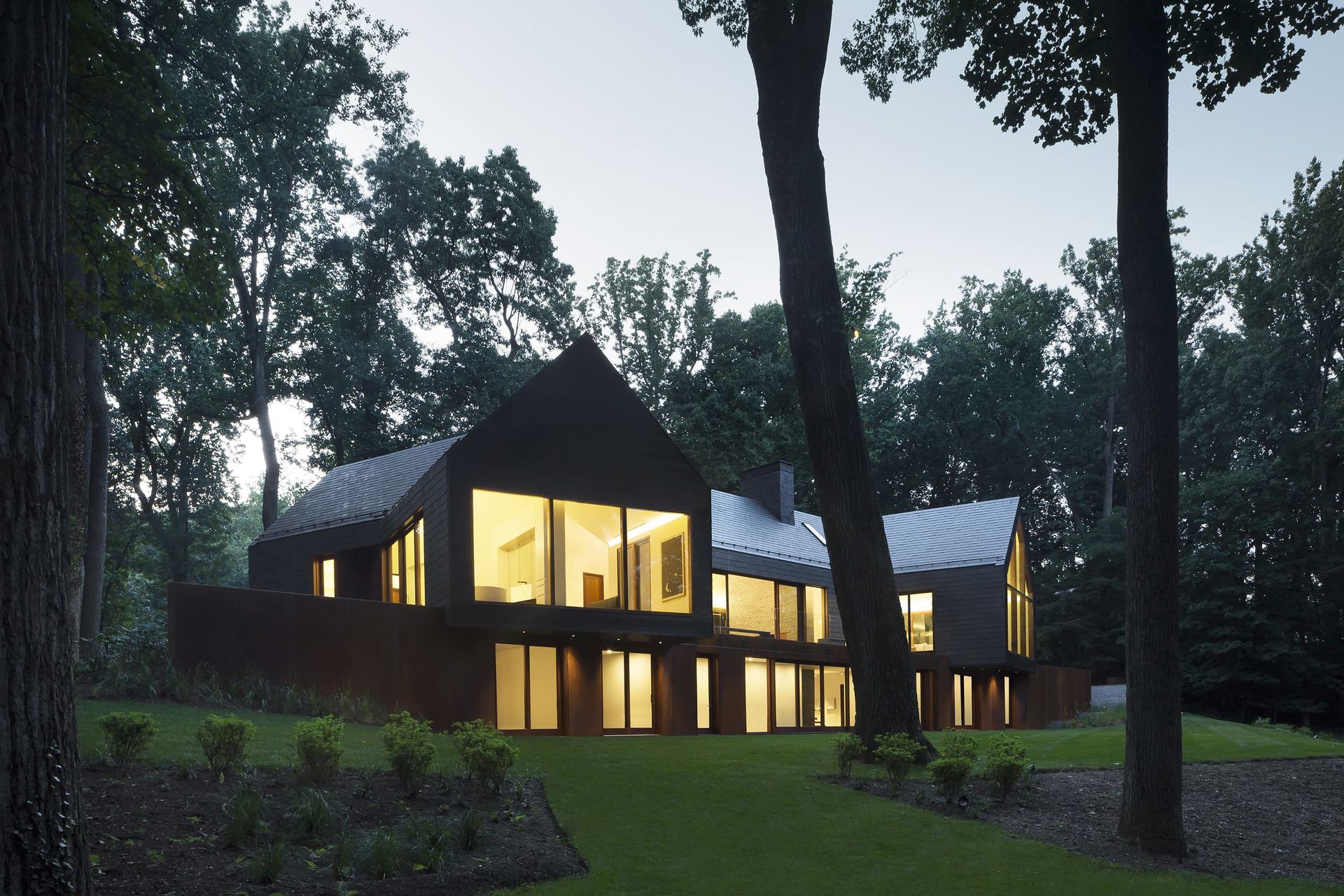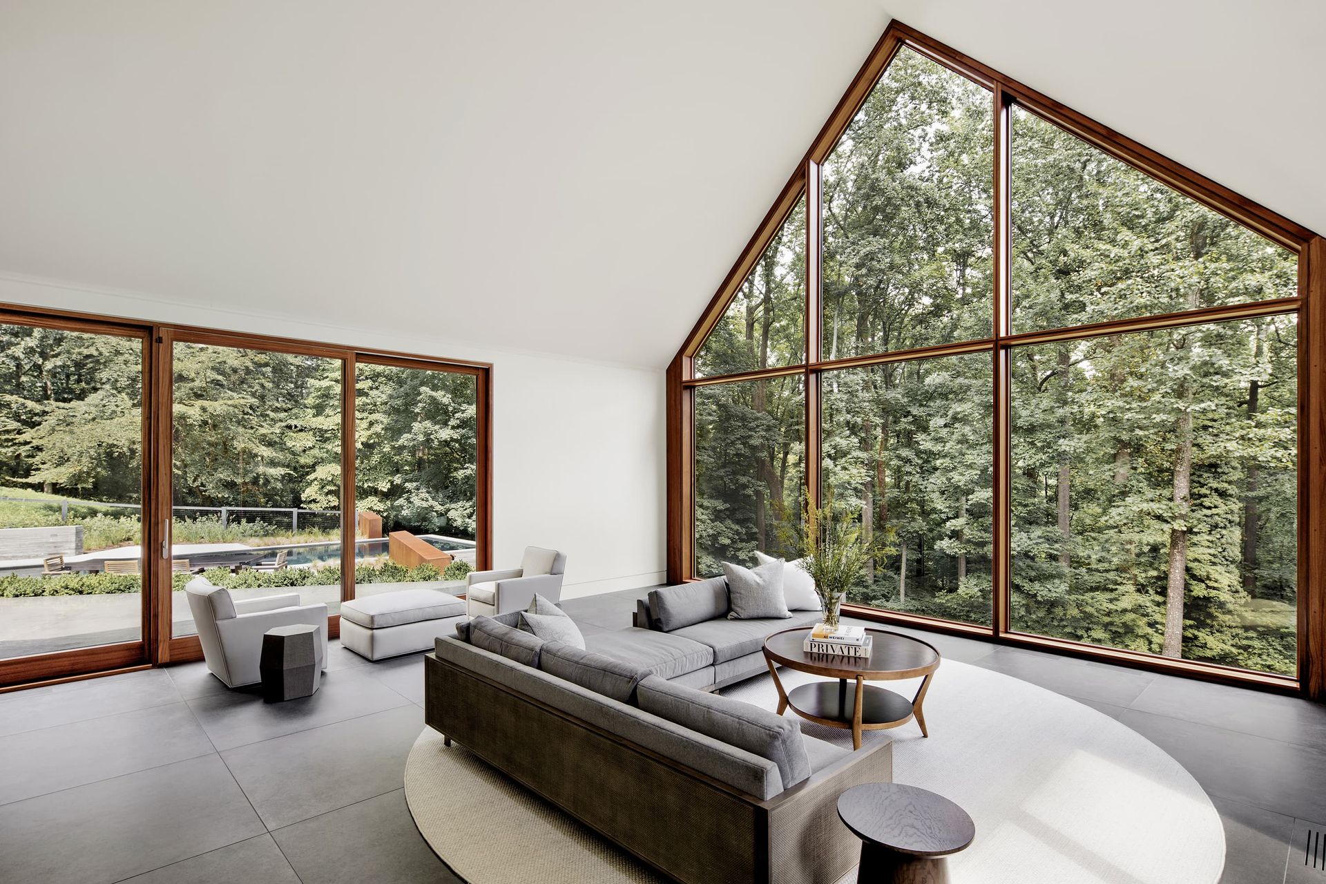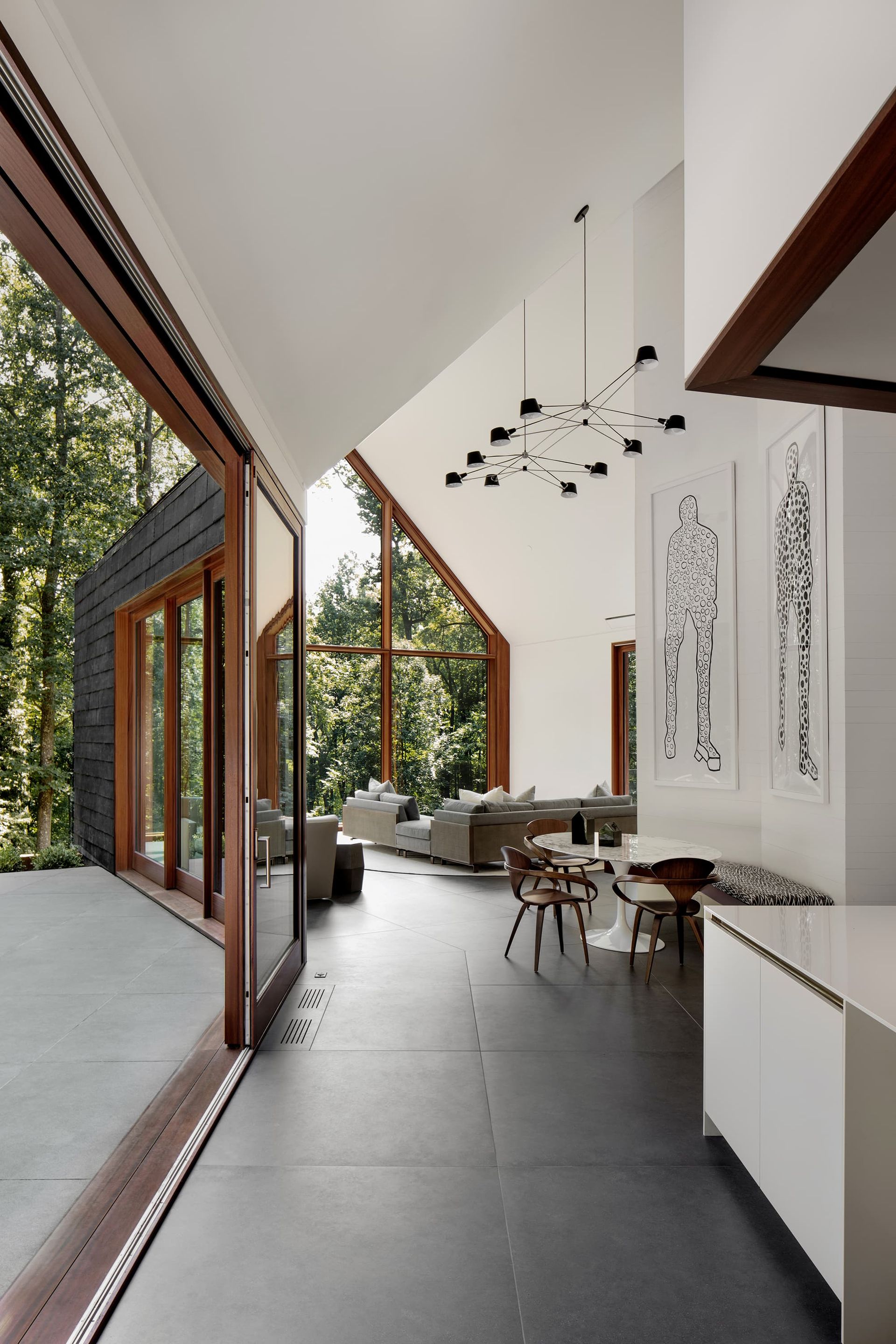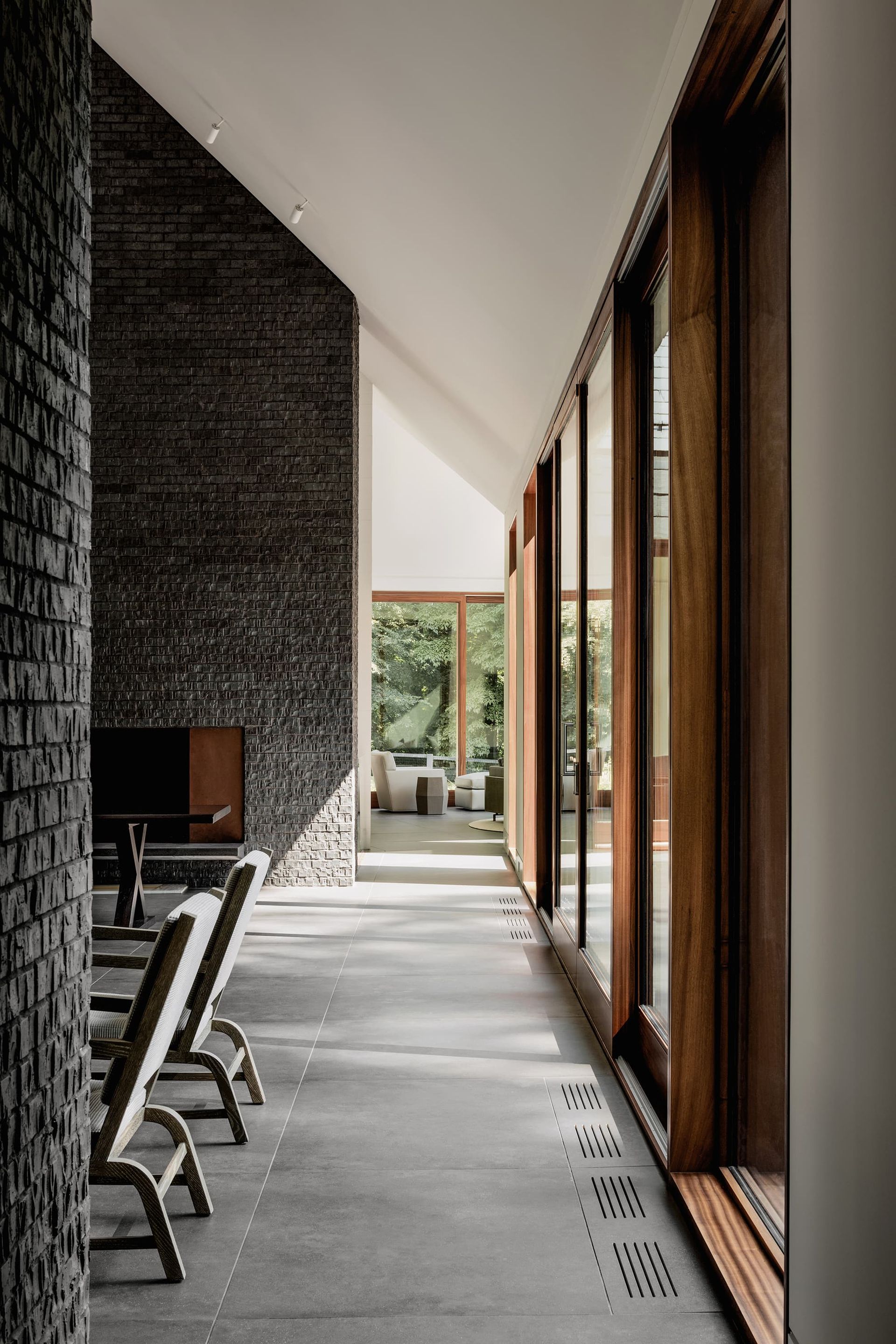 Architecture firm Ziger|Snead and interior designer Jay Jenkins led that vision, shaping the soul of the home around memory and renewal, protection and transparency. The 7,000-square-foot residence embraces an archetypal gable form, deliberate in its simplicity. Cathedral ceilings draw the eye toward the surrounding forest canopy. Dark slate and charred wood protect the façade while referencing the former home. Mahogany-framed window walls dissolve the boundary between interior and landscape. Landscape design by Campion/Hruby reinforces the material discipline, grounding the home in stone, steel, wood, and water.